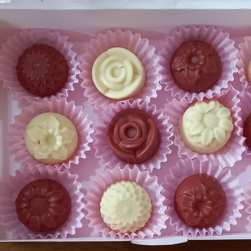 12 bombones de Chocolate blanco presentados en su caja con lazo.