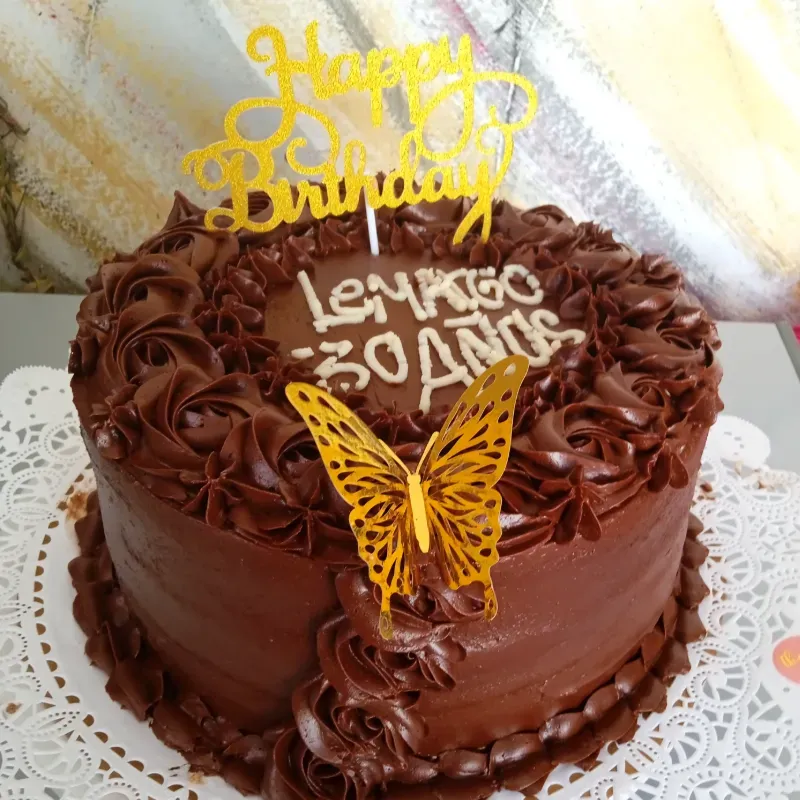 Cake con relleno, masa y cobertura de crema pastelera de chocolate con decoración