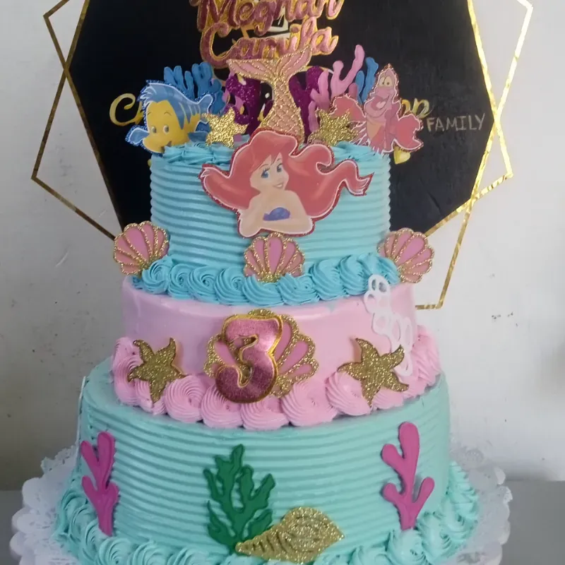 Cake redondo tres pisos, temática sirenita opcional. masa y relleno de chocolate
