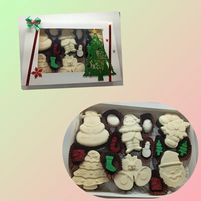 📍6 Figuras Extra Grandes Marmoleadas Rellenas de Galletas María 📍7 Bombones Macisos de Chocolate Blanco 📍2 Huevos de Pascua de Chocolate Blanco