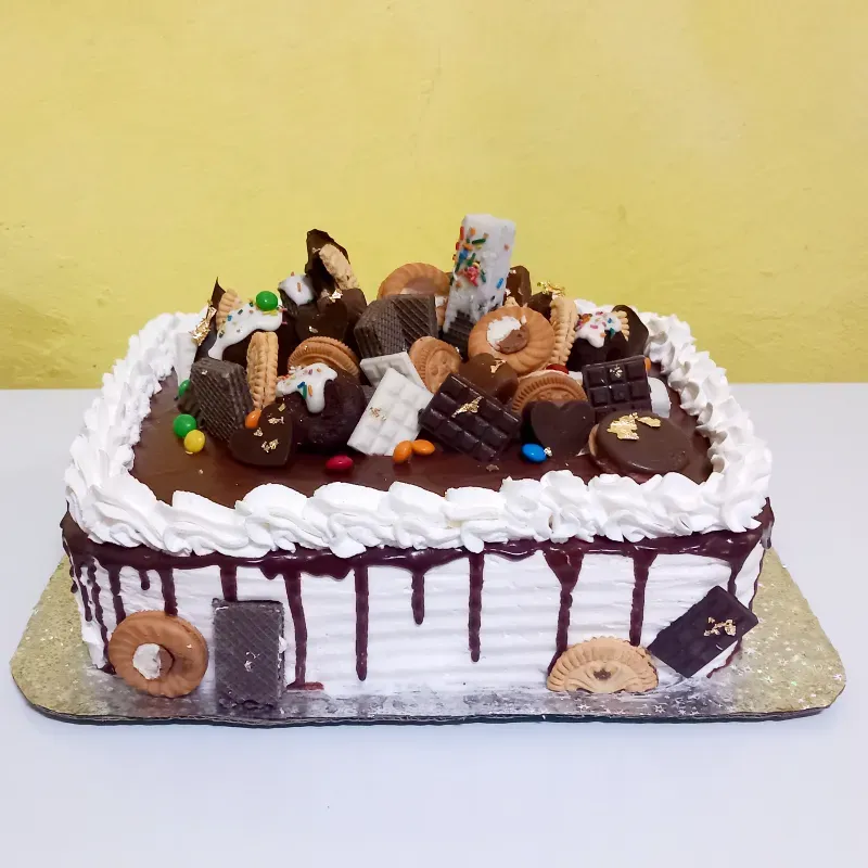Disfruta una experiencia irresistible con nuestra torta Delirio de Chocolate: panetela de vainilla o chocolate, rellena y cubierta de nata natural o de chocolate, coronada con un espectacular drip y una mezcla increíble de chocolatinas y detalles crocantes. ✨ Un capricho premium para celebrar o darte un gusto inolvidable.