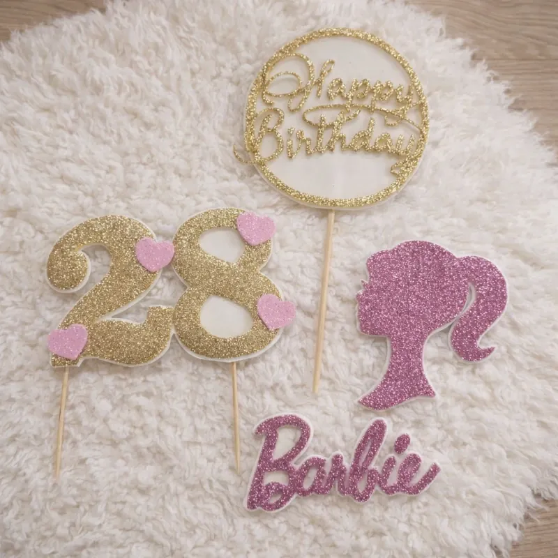 Nuestro Cake Topper de Barbie es una pieza 100% artesanal elaborada con foami (fomi) de alta calidad y detalles en brillo oro y rosa.