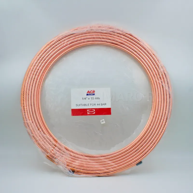 Rollos de tubería de cobre 1/4" x 15 m. Apto para líneas de refrigeración y aire acondicionado (instalaciones residenciales y comerciales). Ideal para reposiciones, tendidos nuevos y stock de taller.