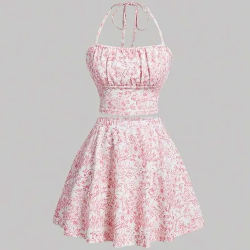 Conjunto de top y falda de mujer con estampado floral y detalles de volantes en la parte superior estilo hamster