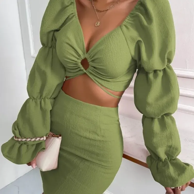 Top corto de puño con volante de manga reunida con abertura con falda ajustada
