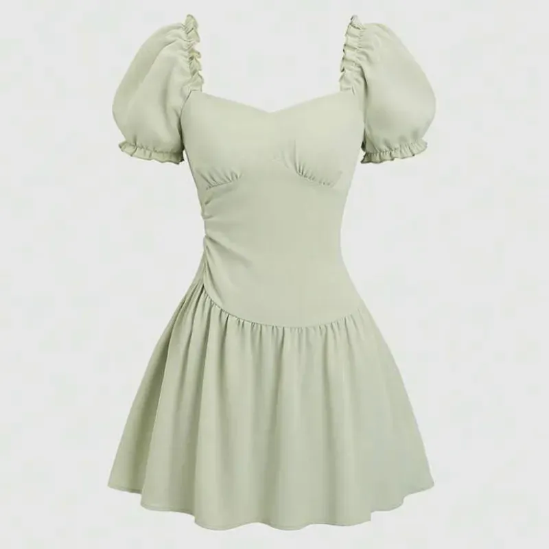 Vestido elegante y casual con escote cuadrado ,mangas abullonadas y pliegues