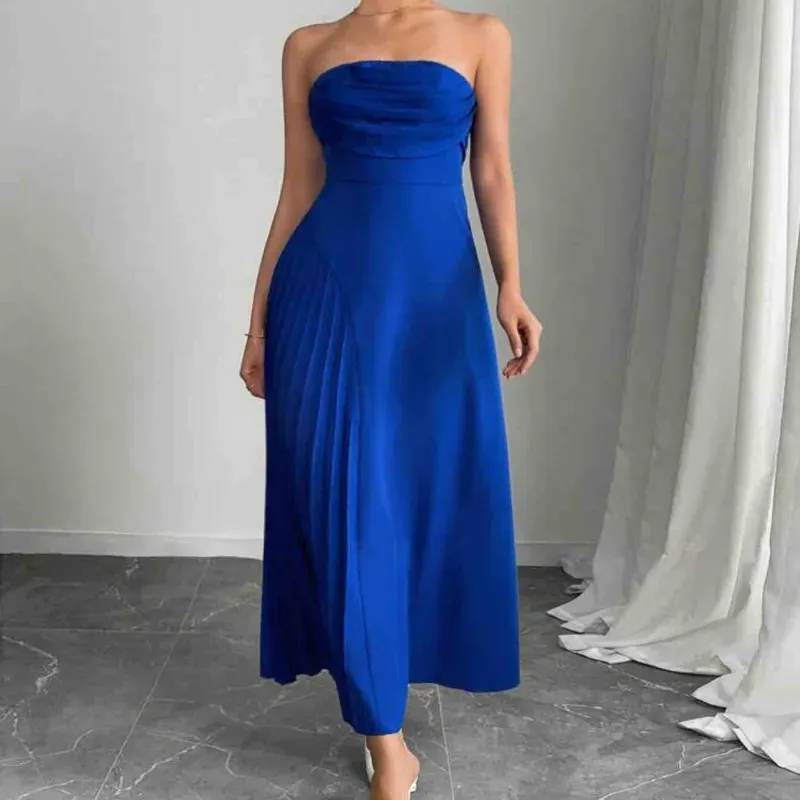 Vestido largo y elegante sin tirantes de mujer con pliegues y diseño de empalme