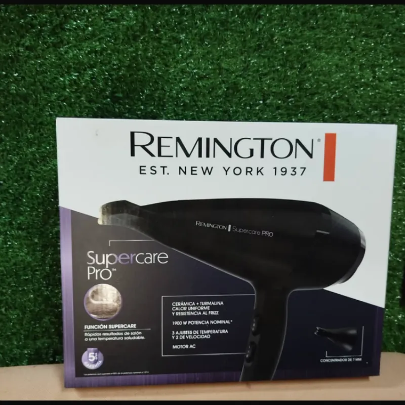 Secador REMINGTON 🖤 Secador para el Cabello, con Cerámica+ Turmalina ;que proporciona un calor uniforme y una resistencia al frizz.... Beneficios: -Posee una función SUPERCARE : "Rápidos resultados de salón a una temperatura saludable " Características :✨ -Rejilla Recubierta de Cerámica + Turmalina. -1900 W Potencia Nominal. -2 Ajustes de Velocidad+3 de Temperatura. -Filtro Removible. -- Gancho para Colgar. -Concentrador de 7MM. -Cable 1.8 M. - Ráfaga de aire frío ,que seca.