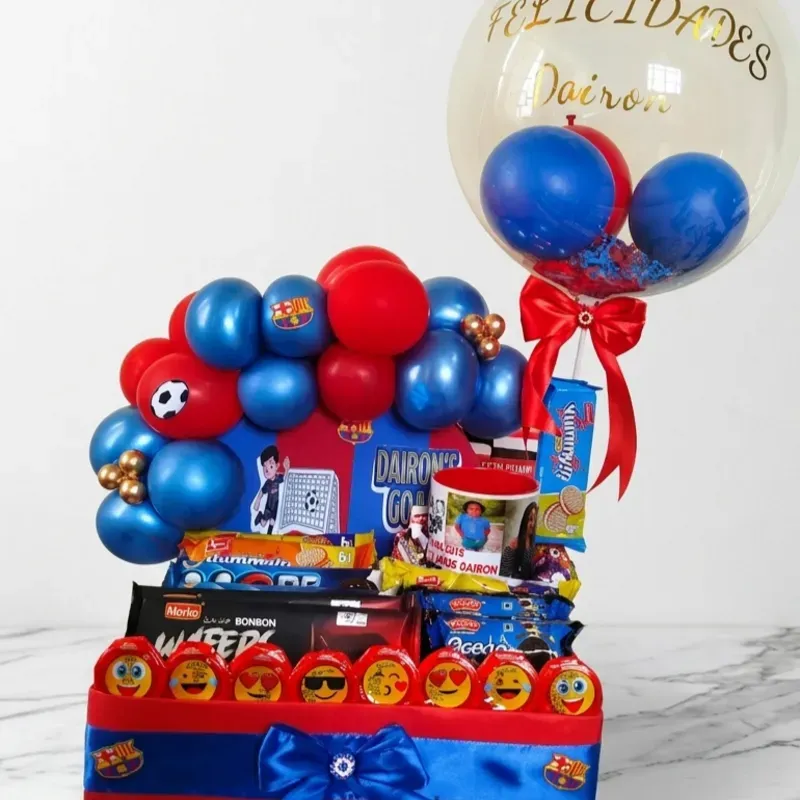 Arreglo con globos, confrituras, jarra personalizada y decoración personalizada