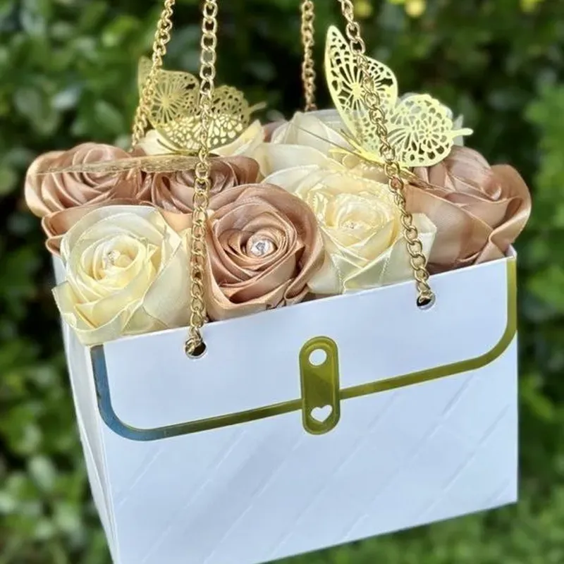 Hermosa cartera con 8 Rosas Eternas decorada con perlas y 2 mariposas