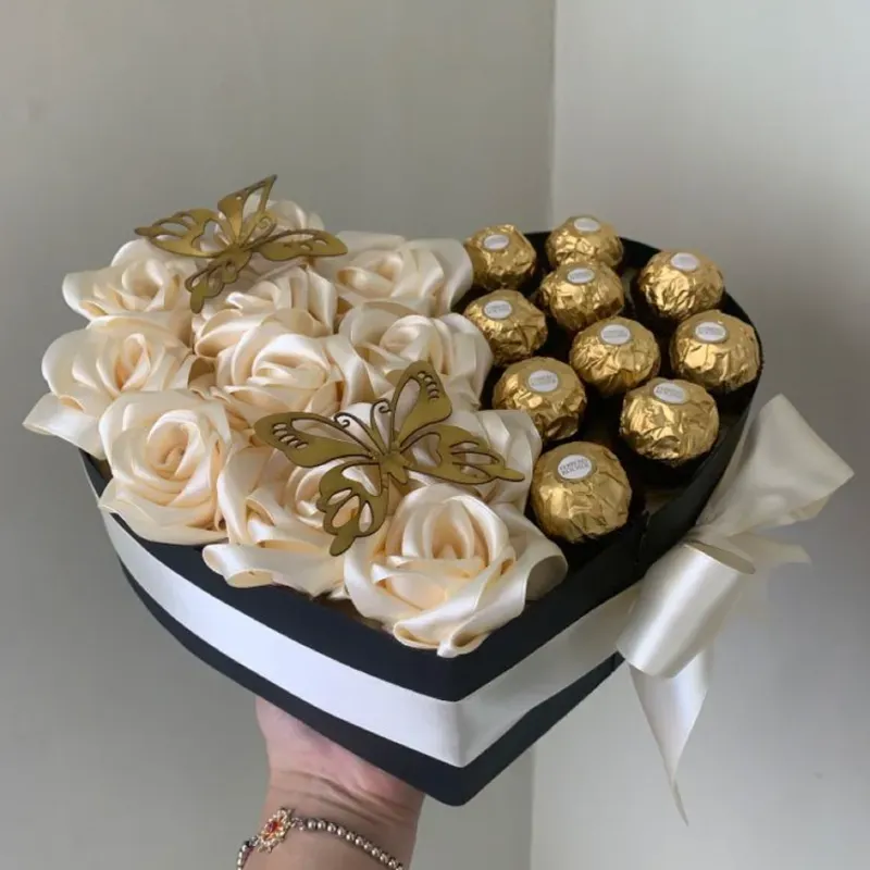 Arreglo en forma de corazón decorado con 10 bombones Ferrero Rocher y 12 Rosas Eternas