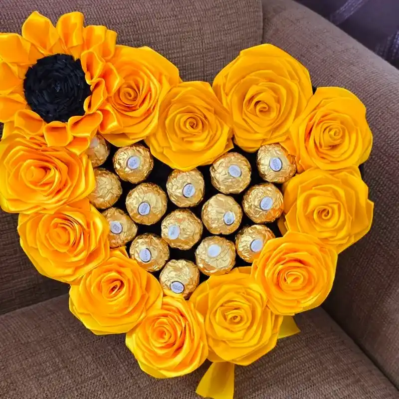 Corazón 💛 con Bombones, Girasol y Rosas Eternas