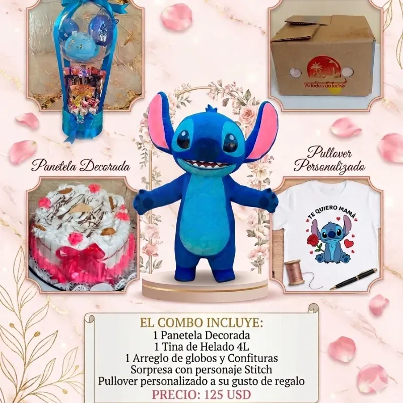 Sorpresa con personaje Stitch, incluye dedicatoria para mamá