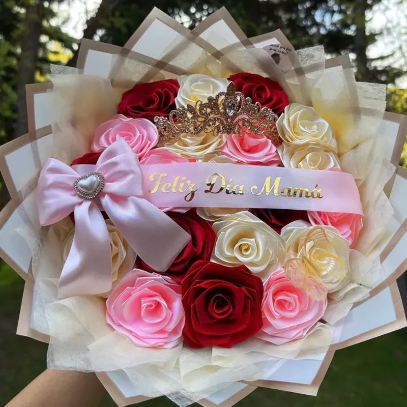 Ramo de 20 Rosas Eternas en diferentes colores, decorada con corona, lazo y cinta personalizada