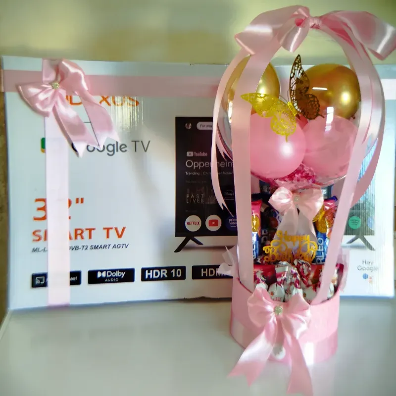 Regalo personalizado con decoración de globos y Confituras+ TV decorado para la Sorpresa