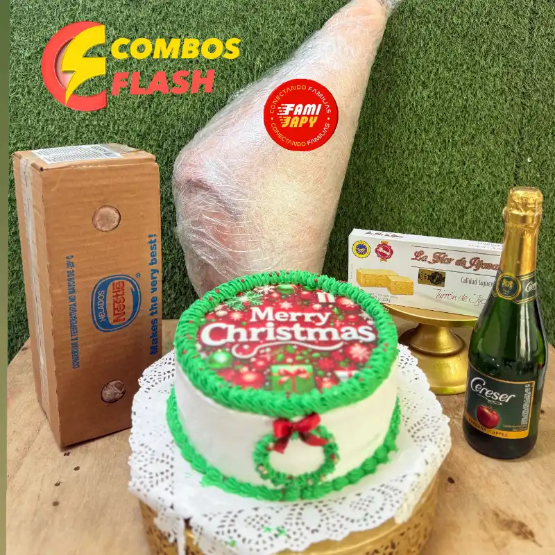 1 PERNIL 20-25 Ib 1 CAKE NAVIDEÑO 1 CAJA DE HELADO 1 BOTELLA DE SIDRA 1 TURRÓN