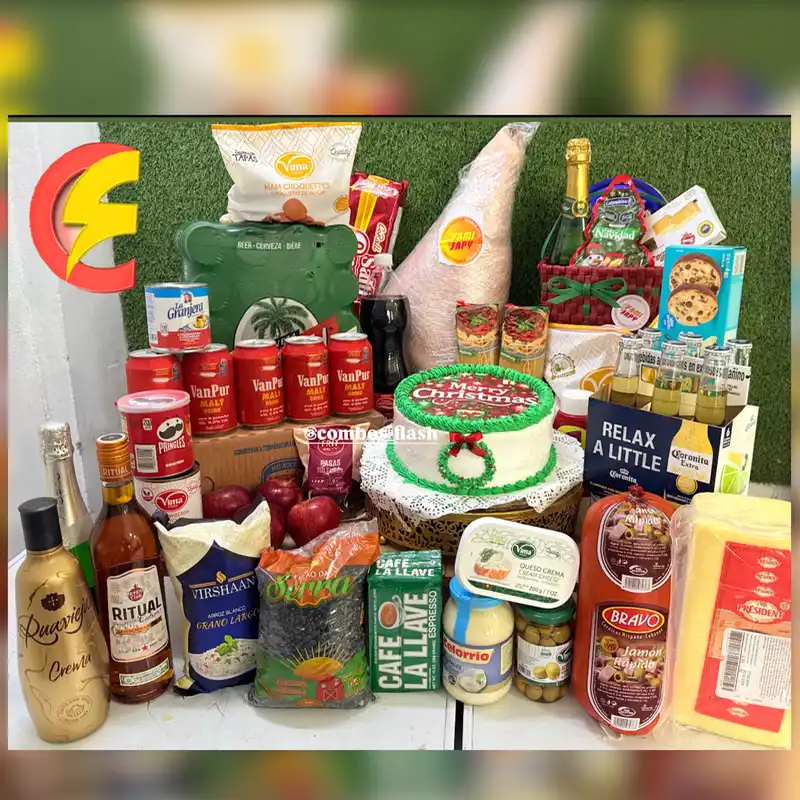 1-Pernil 25-30 lb 1-CAKE NAVIDEÑO 1-CAJA DE HELADO 1-CESTA NAVIDEÑA OSIDRA OTURRÓN OBOMBONES OGALLETAS 1-CAJA DE CERVEZA 1-QUESO GOUDA 1- JAMÓN BRAVO 1- PACK DE PAPAS PREFRITAS 1-KETCUP 1- POMO DE ACEITUNA 1- PACK DE CROQUETAS 2- PACK DE ESPAGUETIS 1-POMO DE MAYONESA 1-POMO DE REFRESCO 12-MALTAS 1- LECHE CONDENSADA 1-QUESO CREMA 1- PACK GALLETAS DE SODA 1- CAFÉ LA LLAVE 3- PACK DE ARROZ 1- PACK DE FRIJOLES 1- RITUAL 1- RUA VIEJA 1- VINO ESPUMOSO 5- MANZANAS 1- PACK DE PASAS 1- FRESAS EN ALMÍBAR 1- SET DE CORONITAS 1- PRINGLES 1- GALLETAS