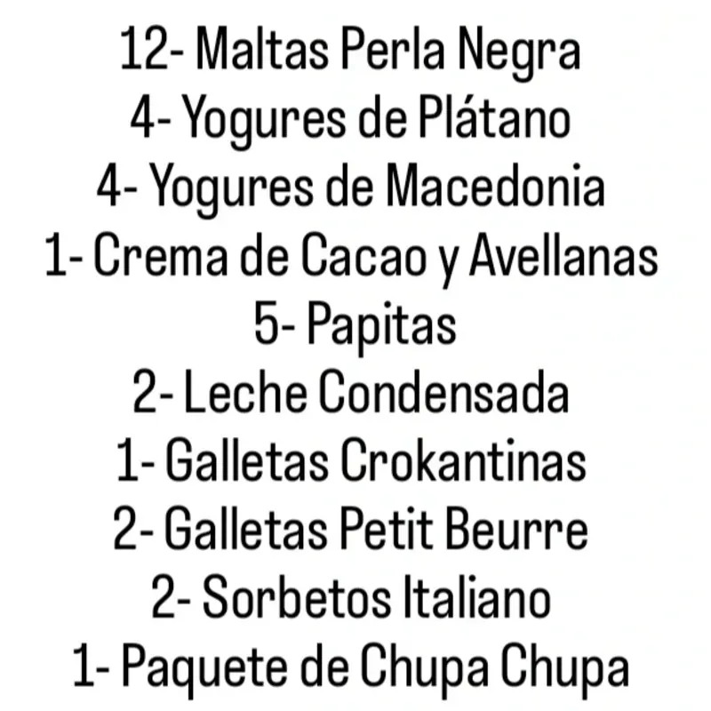 ▪️12- Maltas Perla Negra ▪️4- Yogures de Plátano ▪️4- Yogures de Macedonia ▪️1- Crema de Cacao y Avellanas ▪️5- Papitas ▪️2- Leche Condensada ▪️1- Galletas Crokantinas ▪️2- Galletas Petit Beurre ▪️2- Sorbetos Italiano ▪️1- Paquete de Chupa Chupa