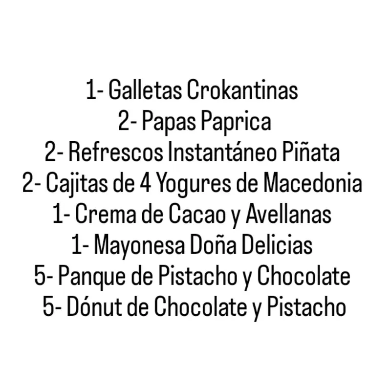 ▪️1- Galletas Crokantinas ▪️2- Papas Paprica ▪️2- Refrescos Instantáneo Piñata ▪️2- Cajitas de 4 Yogures de Macedonia ▪️1- Crema de Cacao y Avellanas ▪️1- Mayonesa Doña Delicias ▪️5- Panque de Pistacho y Chocolate ▪️5- Dónut de Chocolate y Pistacho