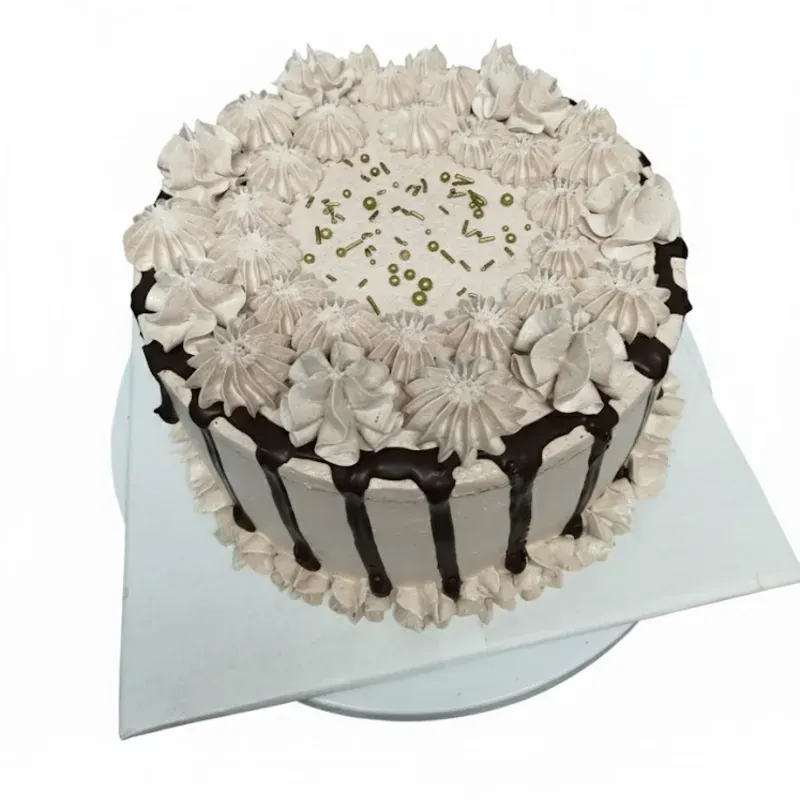 Diámetro: 20 cm, Altura: 10 cm, Merengue sabor a chocolate, Relleno de chocolate, biscocho de chocolate, Drip de chocolate