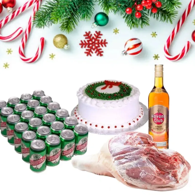 1 panetela 3 leches 1 caja de cerveza cristal 1 botella de ron havana Club Especial de 1lt 1 Muslo de cerdo de 20lb