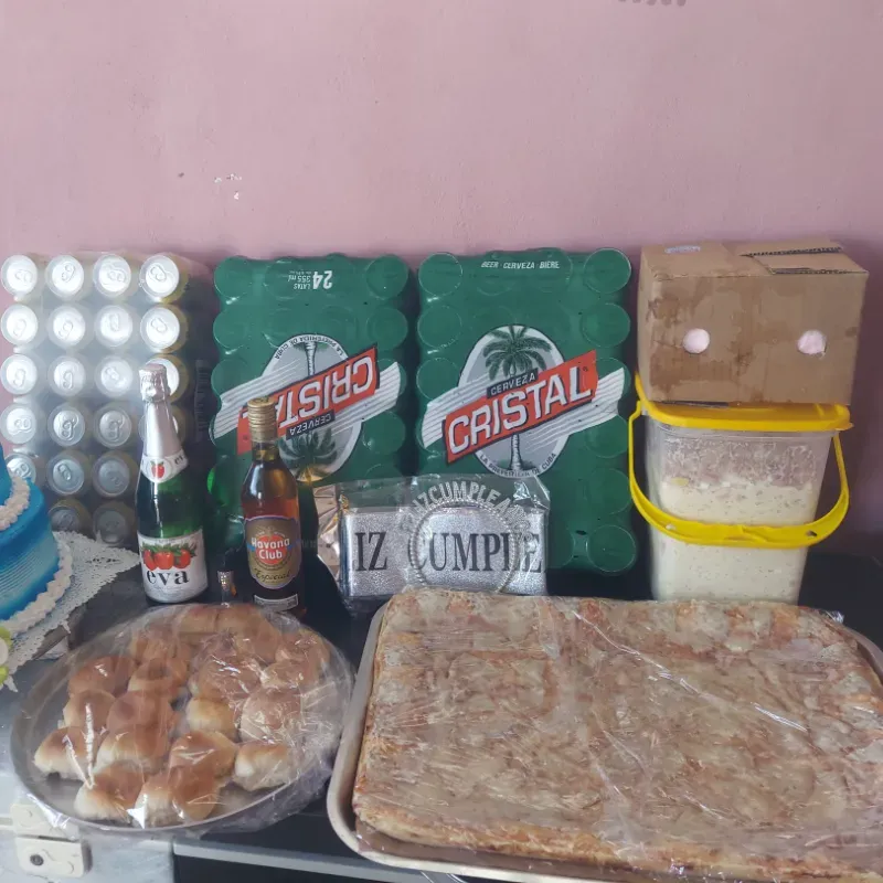 Kake doble altura plus 4lt Ensalda fría 50 bocaditos 2 cajas de cerveza cristal 1 Hablana club 1Pizza familiar 1 Caja de mata bucanero 4lt de helado 1 cidra