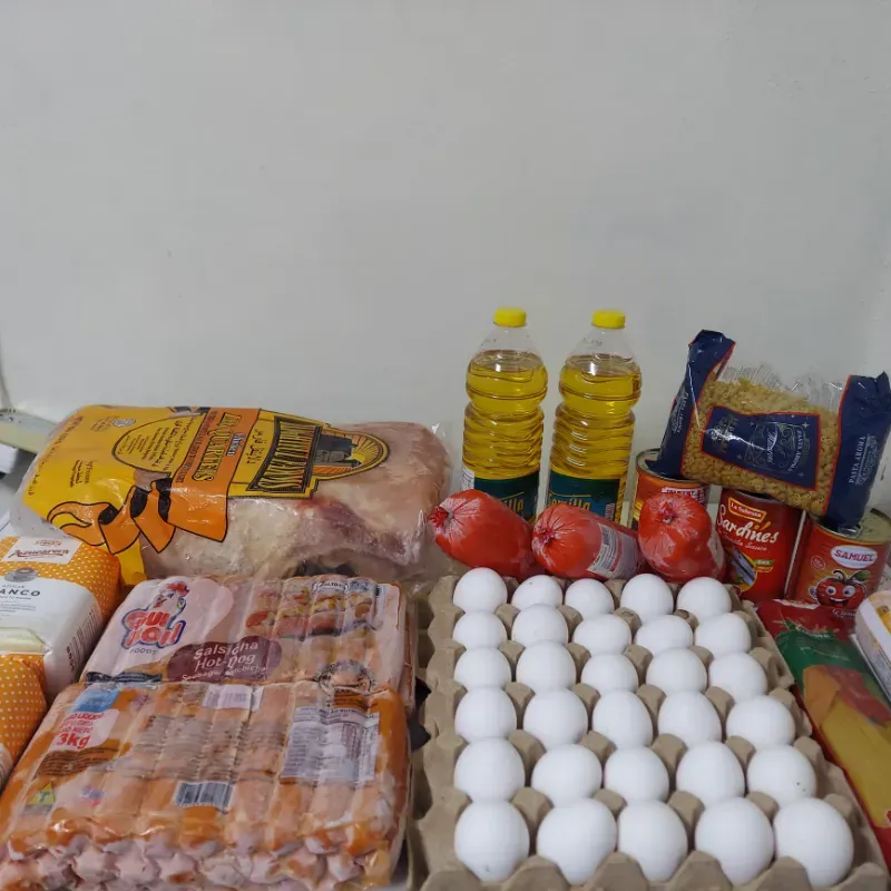 1 paquete de pollo de 10 lb 1 paquete grande de salchichas de 3 kg 3 tubos de picadillo 1 mortadella de 1 kg 1 Fili de huevos 2 bolsas de azúcar de 1 kg cada una 2 pomos de aceite 1 codito 1 spaghetti 1 lata de pasta de tomate 1 lata de sardina 1 lata de spam de res