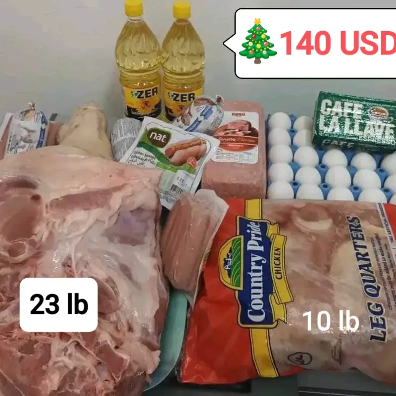 Pernil de 23 lb 5 lb de jamón 10 lb de pollo 3 picadillos 3 salchichas 1 Fili de huevos 1 café La Llave 2 pomos de aceite