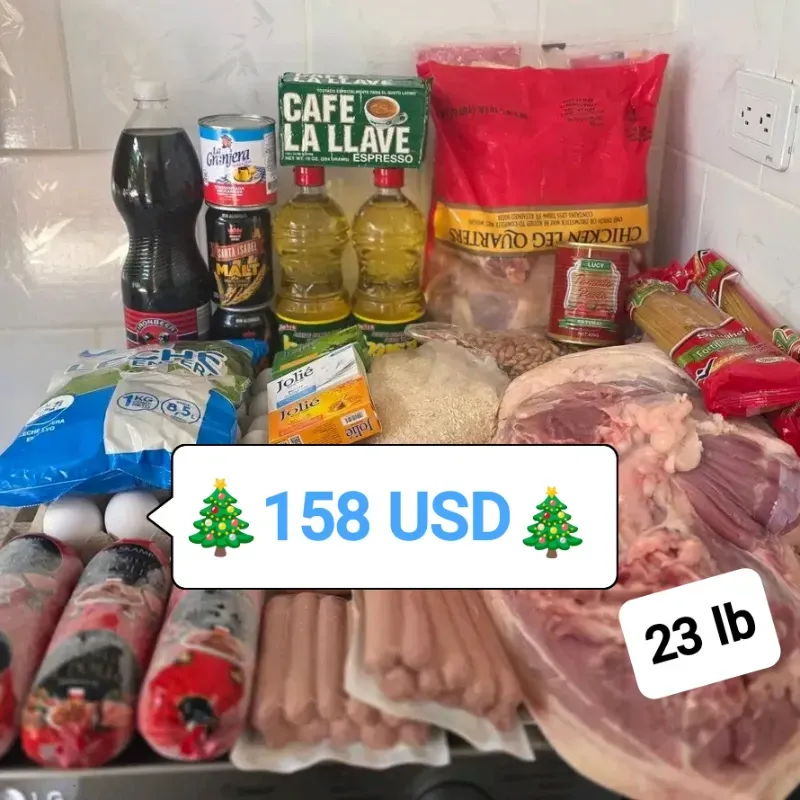 Pernil de 23 lb 10 lb de pollo 2 salchichas 3 picadillos 5 lb de arroz 5 lb de frijoles 1 Fili de huevos 1 leche de 1 kg 2 spaghetti 1 lata de pasta de tomate 1 gelatina 2 latas de malta 1 leche condensada 1 pomo de refresco de gas 1 café La Llave 2 aceite