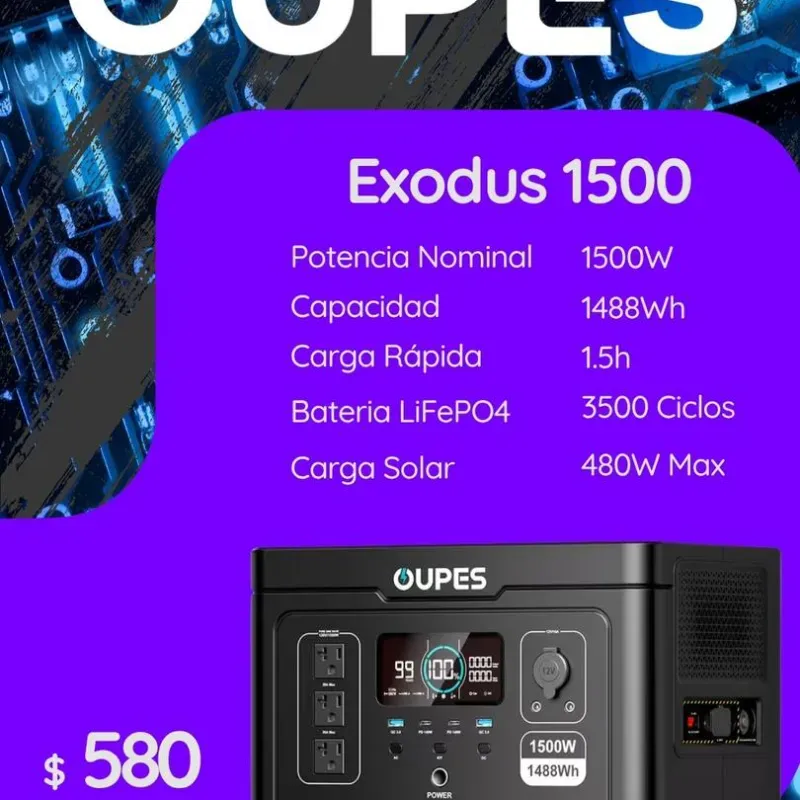 • Potencia de salida: 1500 W (suficiente para alimentar electrodomésticos pequeños y medianos)