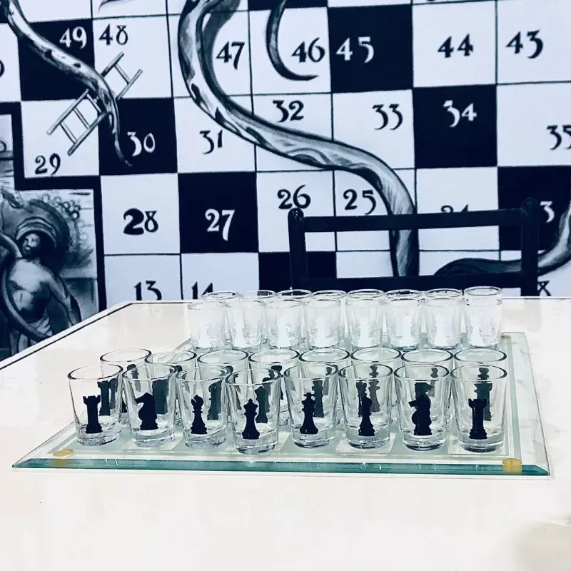 Ajedrez de shot, seguro te encantará, rellena tus fichas con la bebida de tu elección (Wisky o Vodka) y disfruta jugando juntos a unas sabrosas salchipapas