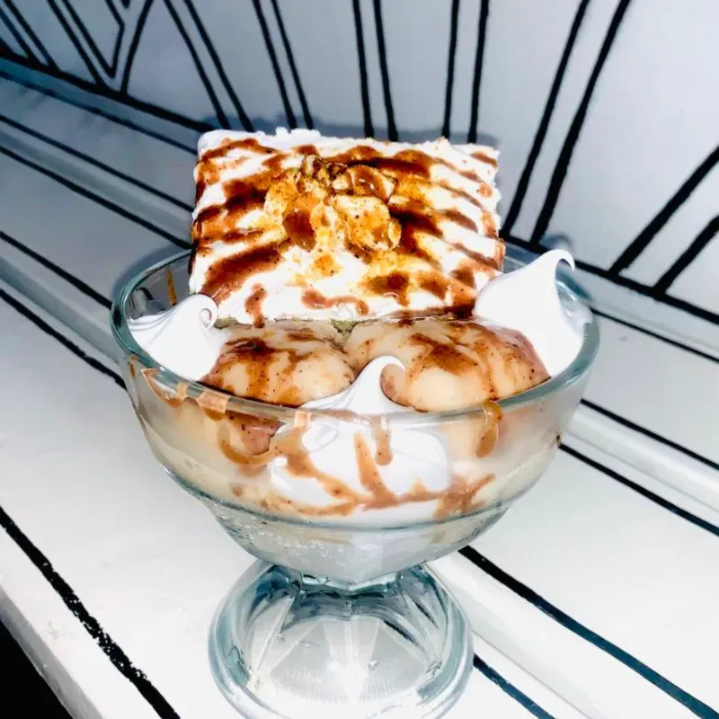 Delicioso helado con panetela y crema de chocolate