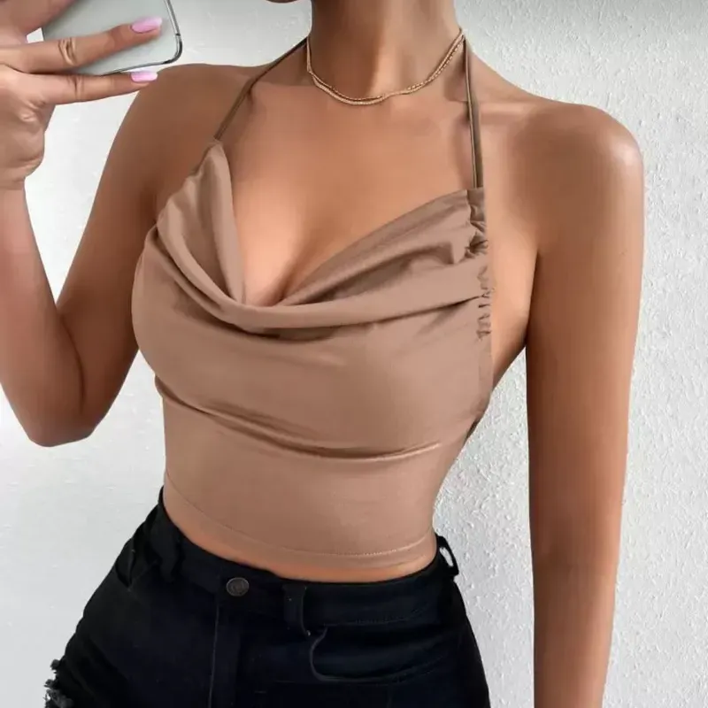Blusa carmelita de cuello drapeado y espalda afuera