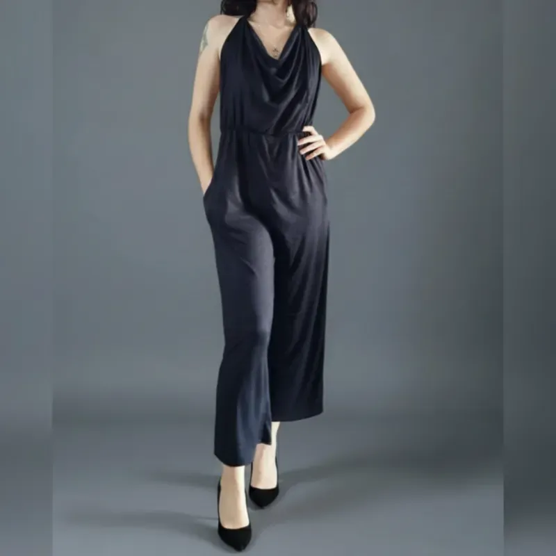 Enterizo escote drapeado con espalda descubierta y bolsillos