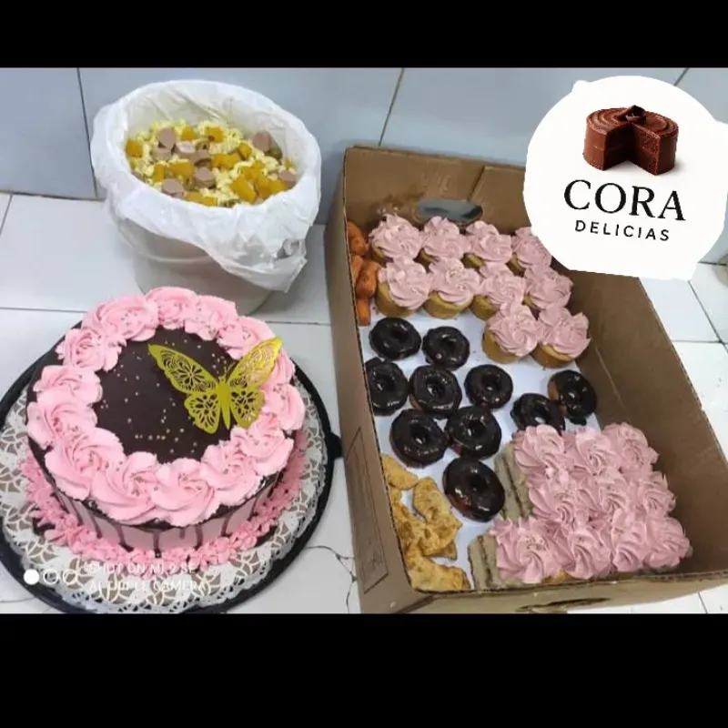 Cake de 20 cm con cobertura de chocolate + 10 cupcakes+ 10 mindonas+ 10 marquesita rellena +10 pasteles+ 10 croquetas + 4lb de ensalada fría con piña