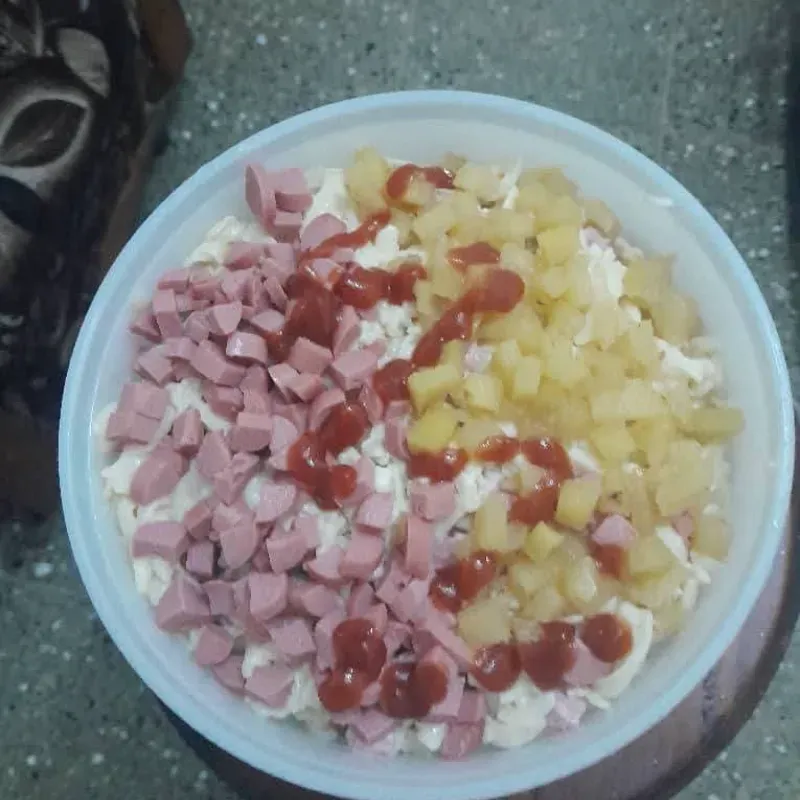 con coditos o espaguetis, jamón viking o salchicha, queso blanco, mayonesa y piña