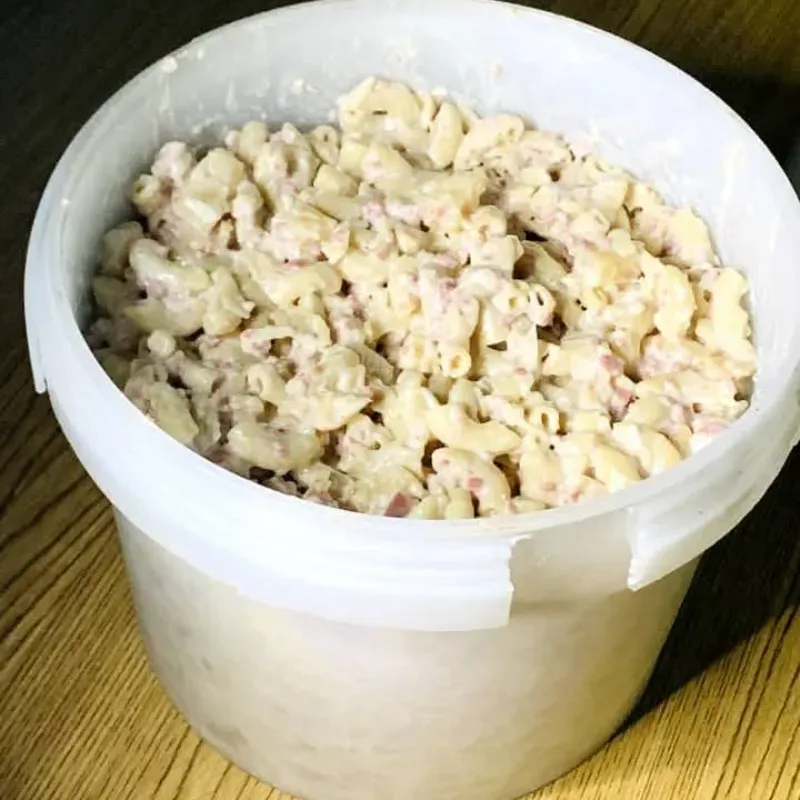 con coditos o espaguetis, jamón viking o salchicha, queso blanco, mayonesa