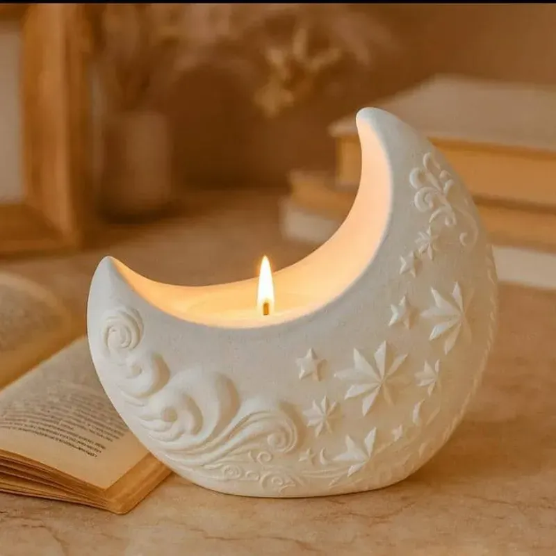 Elegante maceta de yeso con forma de luna y relieves. Para plantas artificiales o para velas (no incluidas)