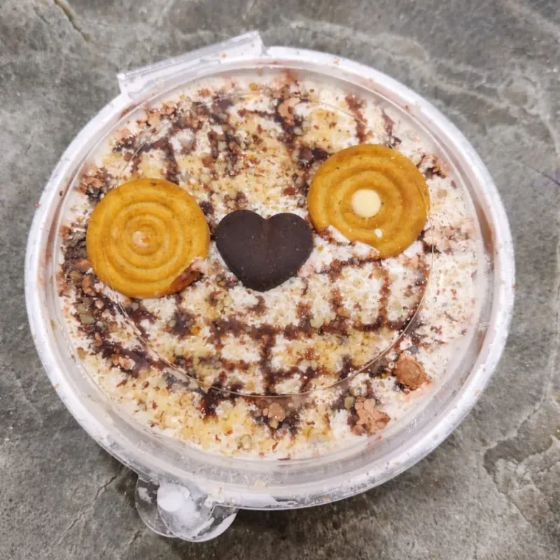Postre frío con una capa de bizcocho, helado cremoso, sirope de chocolate, maní triturado y galletas crujientes, coronado con un delicioso bombón de chocolate.