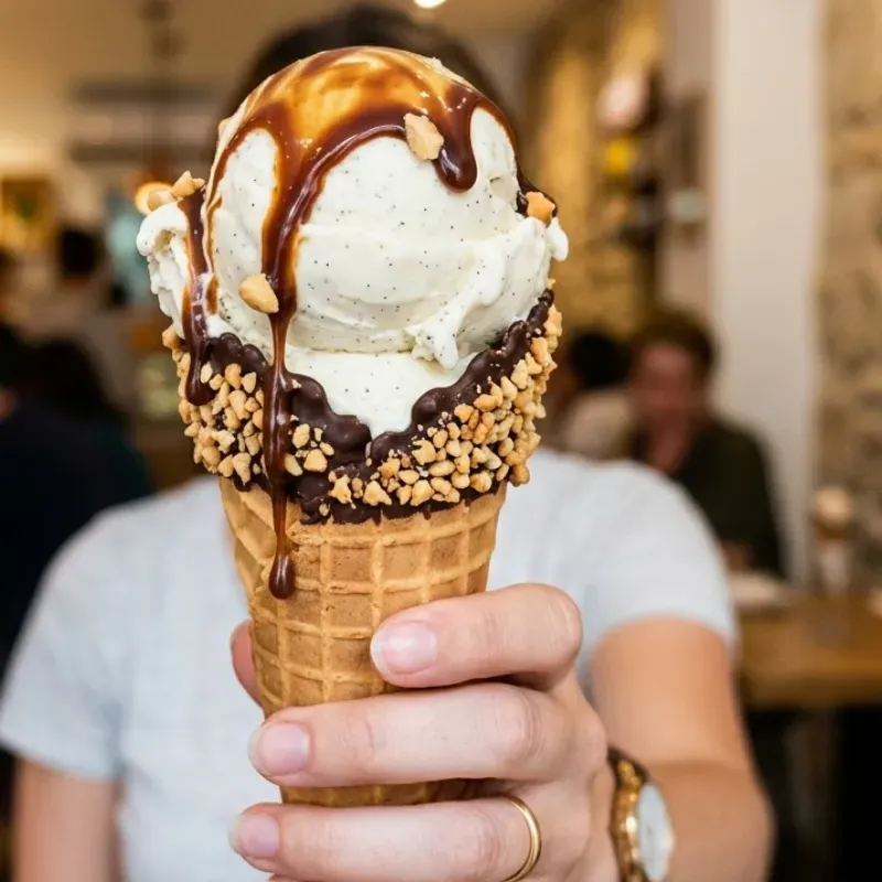 "Nuestra joya rústica: Un cono artesanal con un borde macizo de maní tostado e incrustado en chocolate. Relleno con nuestro helado más cremoso y hilos de fanguito artesanal. La experiencia definitiva de 'El Montañés' para quienes buscan el máximo crujiente en cada bocado."