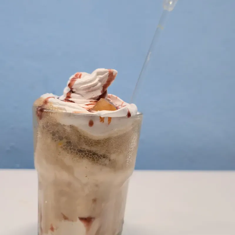 "Dos bolas de helado premium sumergidas en refresco de cola e hilos de sirope de chocolate. Coronado con una firme nube de merengue y decorado con una pieza de fruta de temporada o en almíbar (Fresa, Pera, Mango o Frutos Rojos u otras). Un postre clásico, refrescante y con un acabado artesanal único."