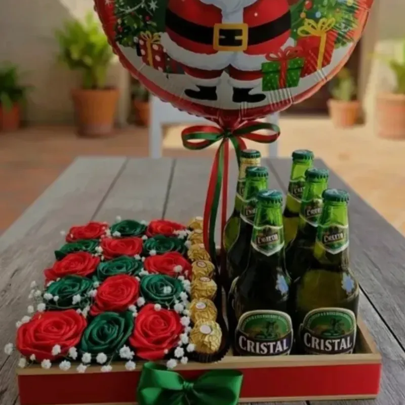 Bandeja con rosas eternas , globo 6 cervezas o maltas 6 bombones