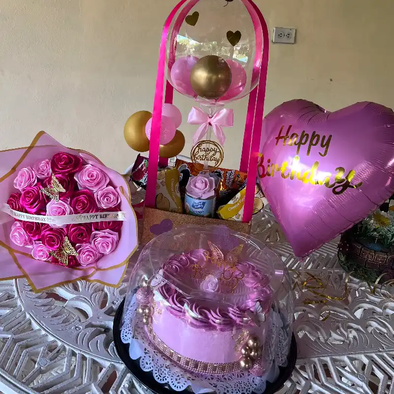 Pastel 3 leches , ramo de rosas eternas de 20 rosas con decoración de mariposas , caja decorada con globos y confituras , incluye la animación de la mascota .