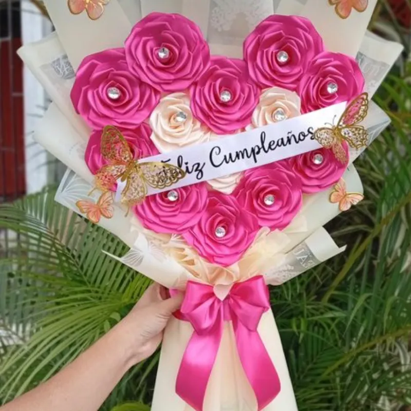 Ramo con 12-15 rosas eternas en forma de corazón con decoración de mariposas