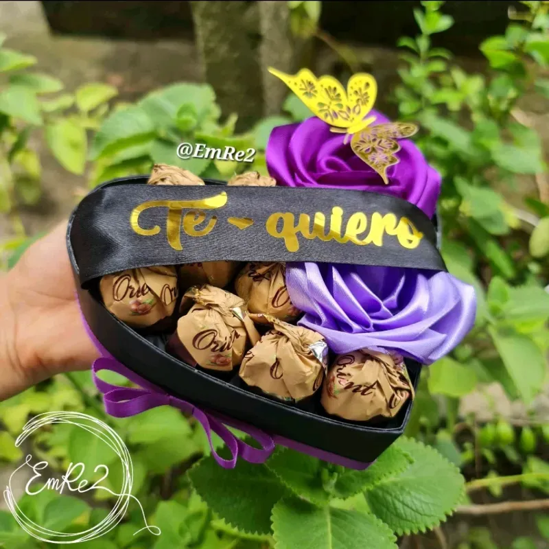 • La caja en forma de corazón es confeccionada principalmente con materiales reciclables (cartulina, cartón, papeles decorstivos, etc...) está distribuida en 2 mitades una de flores eternas y la otra de bombones (marcas variadas según nuestra disponibilidad).