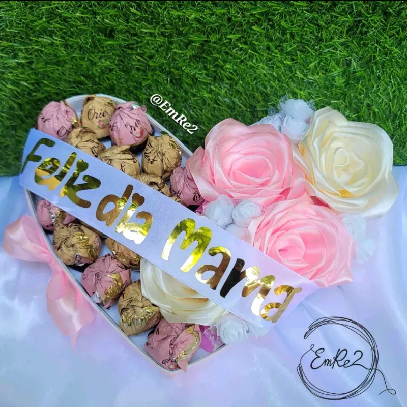 La caja en forma de corazón es confeccionada principalmente con materiales reciclables (cartulina, cartón, papeles decorstivos, etc...) está distribuida en 2 mitades una de flores eternas y la otra de bombones (marcas variadas según nuestra disponibilidad).