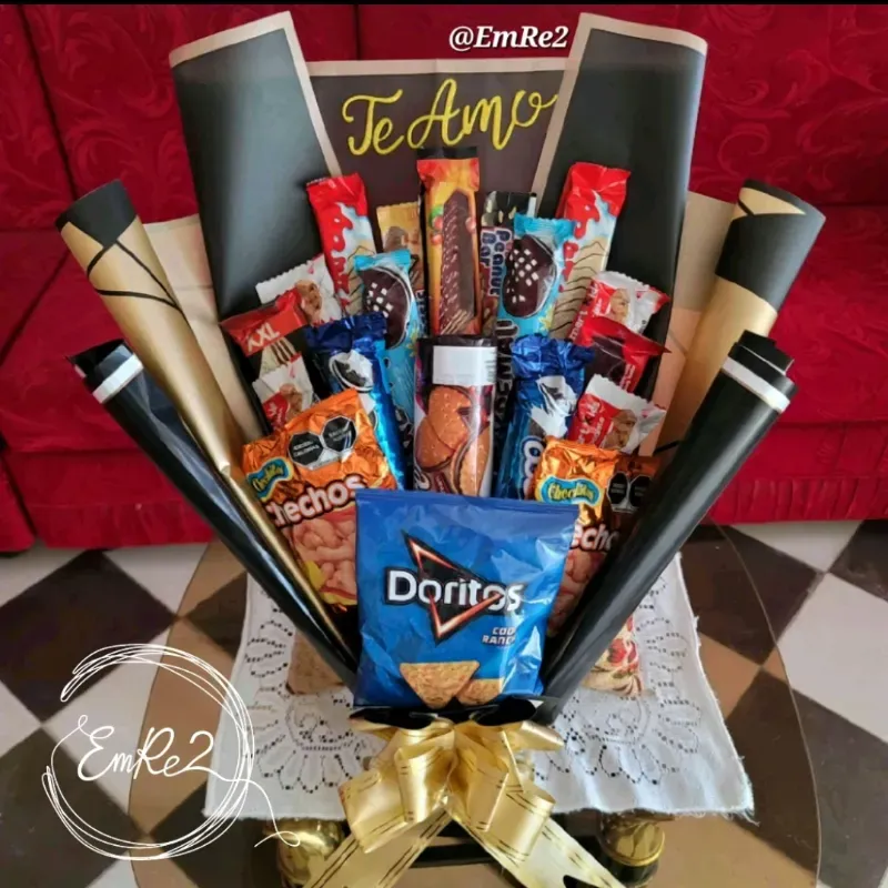 El Ramo de Confituras es un excelente obsequio para quien adora los dulces. Sus dimesiones son de 50×40cm aprox.