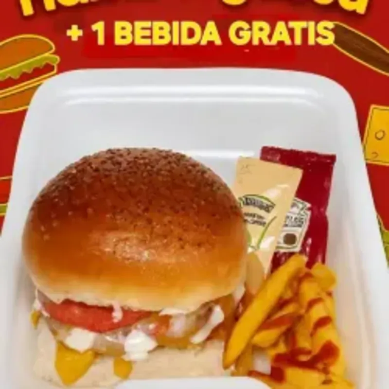 2 Hamburguesas de carne y cerdo queso Gouda , jamón bravo ,bacon , tomate , pepino y papas fritas ( ketchup , moztasa , mayonesa etec