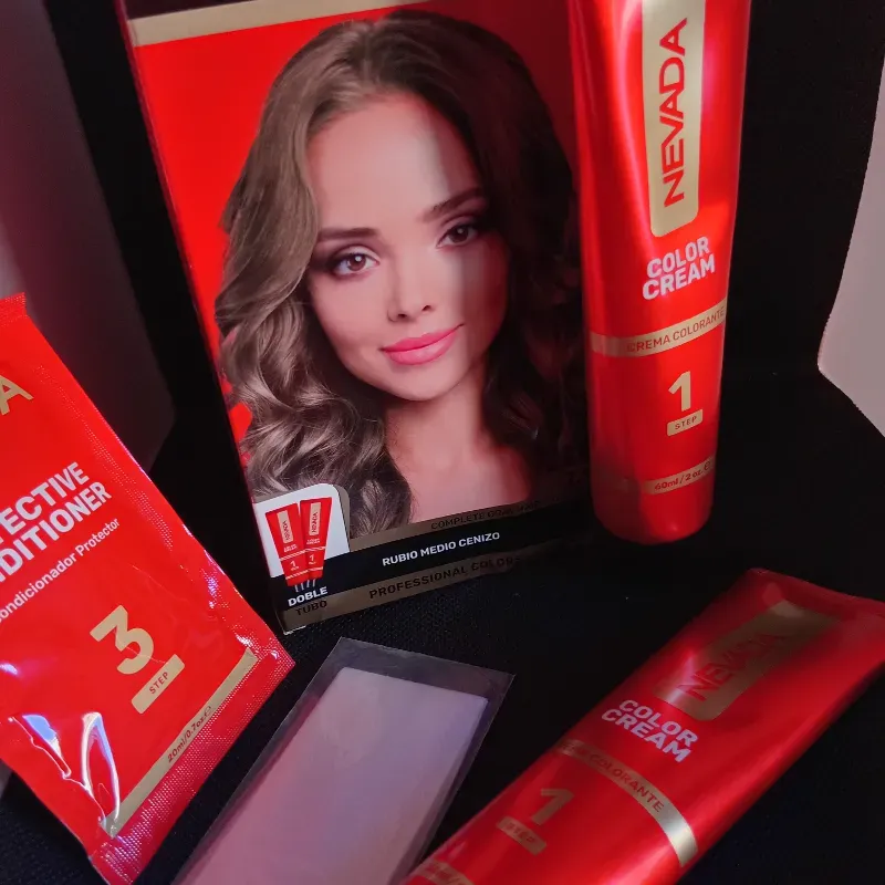 Trae 2 tubos de tinte , acondicionador, guante y peroxido para ambos tubos