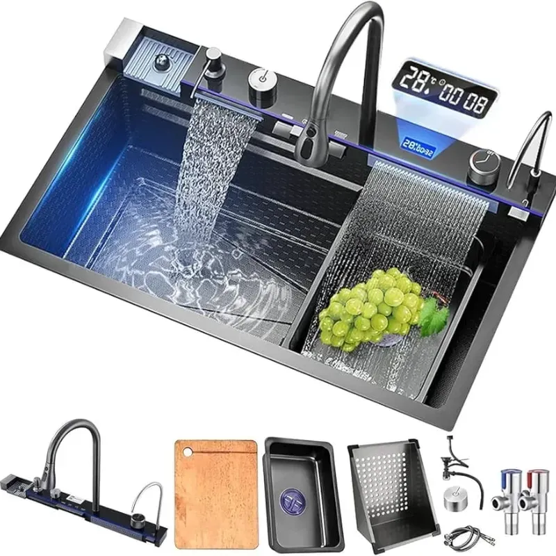 Fregaderos Inteligentes de Acero Inoxidable Multifuncional, Plateado Set para lavado de vasos 2 Tiros de cascada Tiro vertical con contrapeso 2 Escurridores Cifa Llave de ángulo Tabla para cortar Sensor de temperatura Pila simple Dispensador de gel